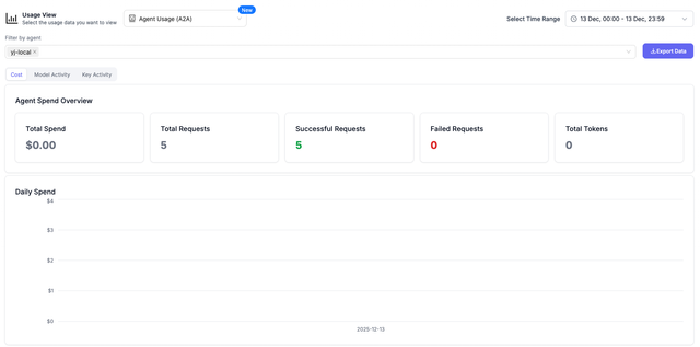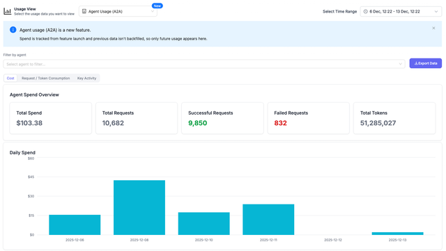 Navigate to the Agent Usage tab in the Admin UI to view agent-level spend analytics: