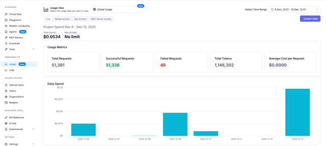 - Activity metrics: Track requests, tokens, and success rates per agent