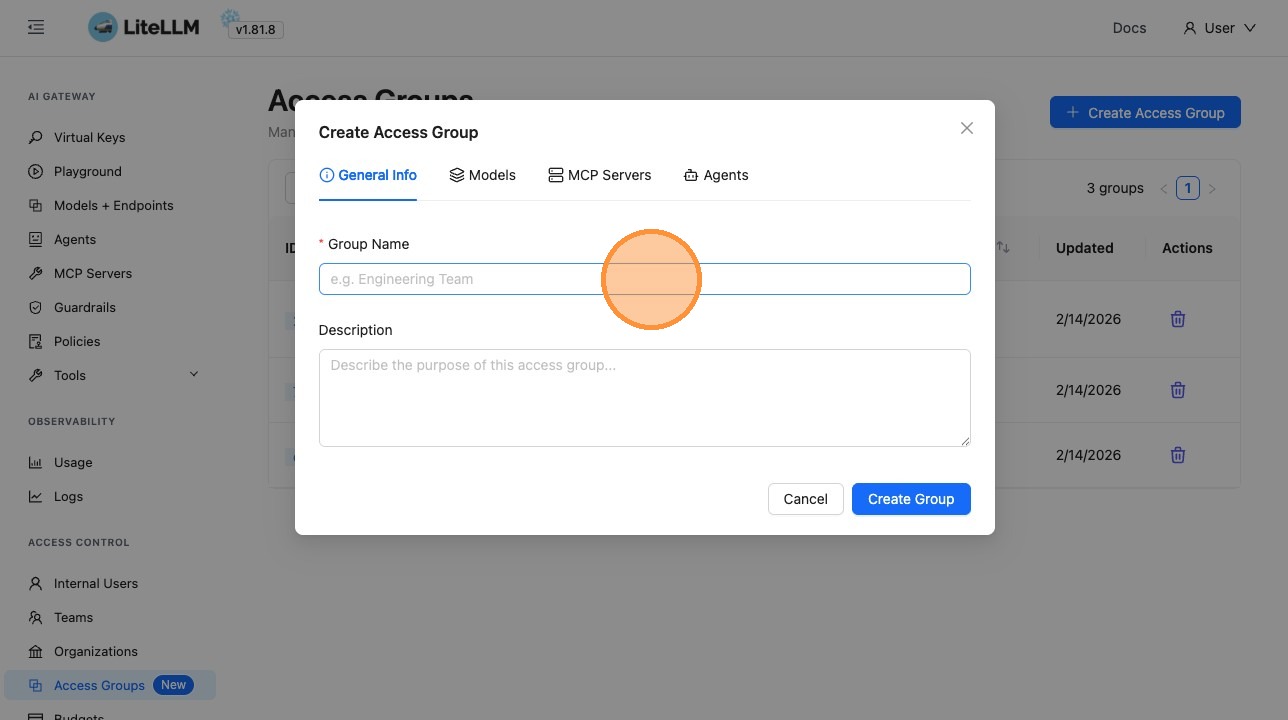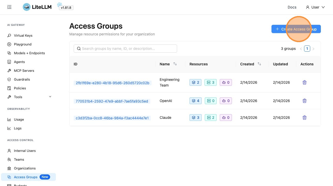 Go to the Admin UI (e.g. http://localhost:4000/ui or your PROXY_BASE_URL/ui) and click Access Groups in the sidebar.