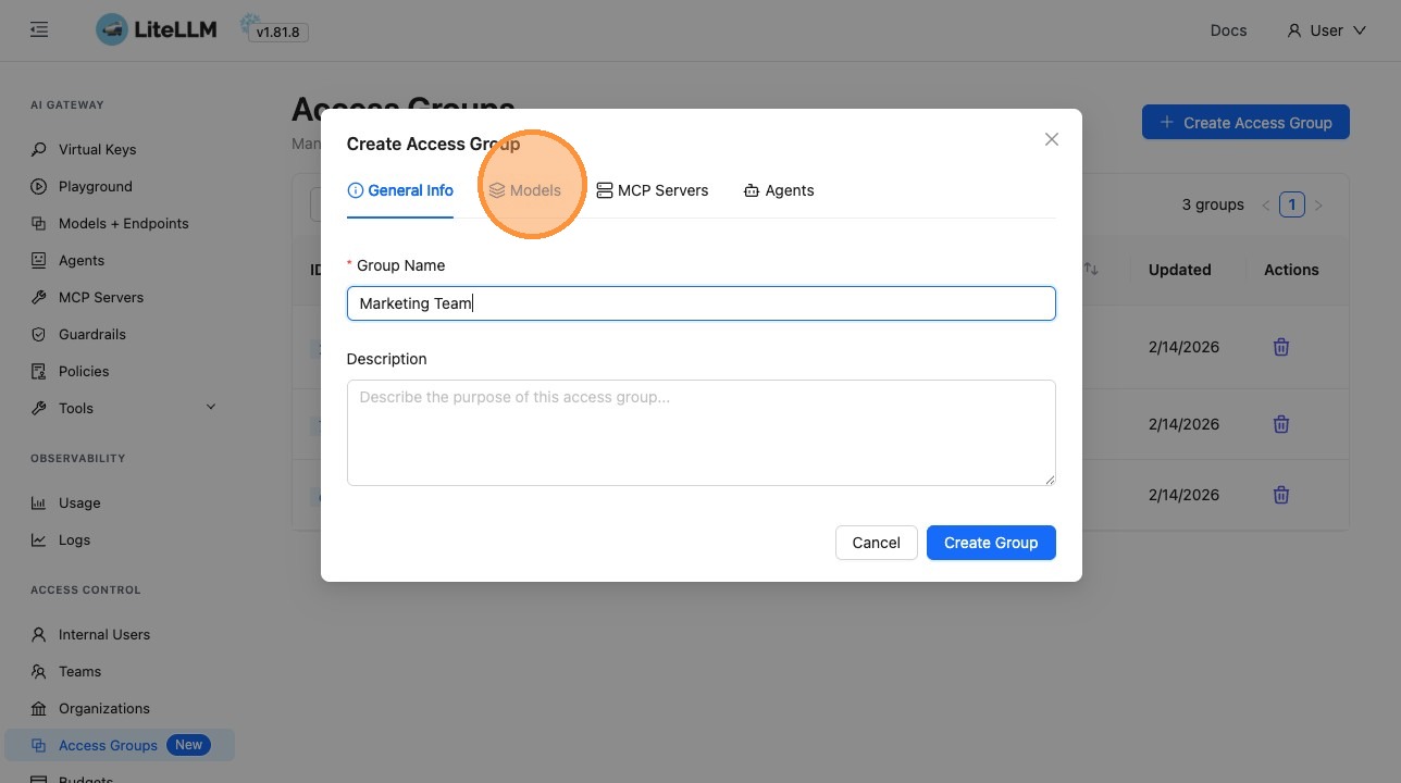 Create groups like "Engineering", "Data Science", or "Product" with the models, MCP servers, and agents each team needs. Attach the group to the teamβno need to configure each resource on every key.