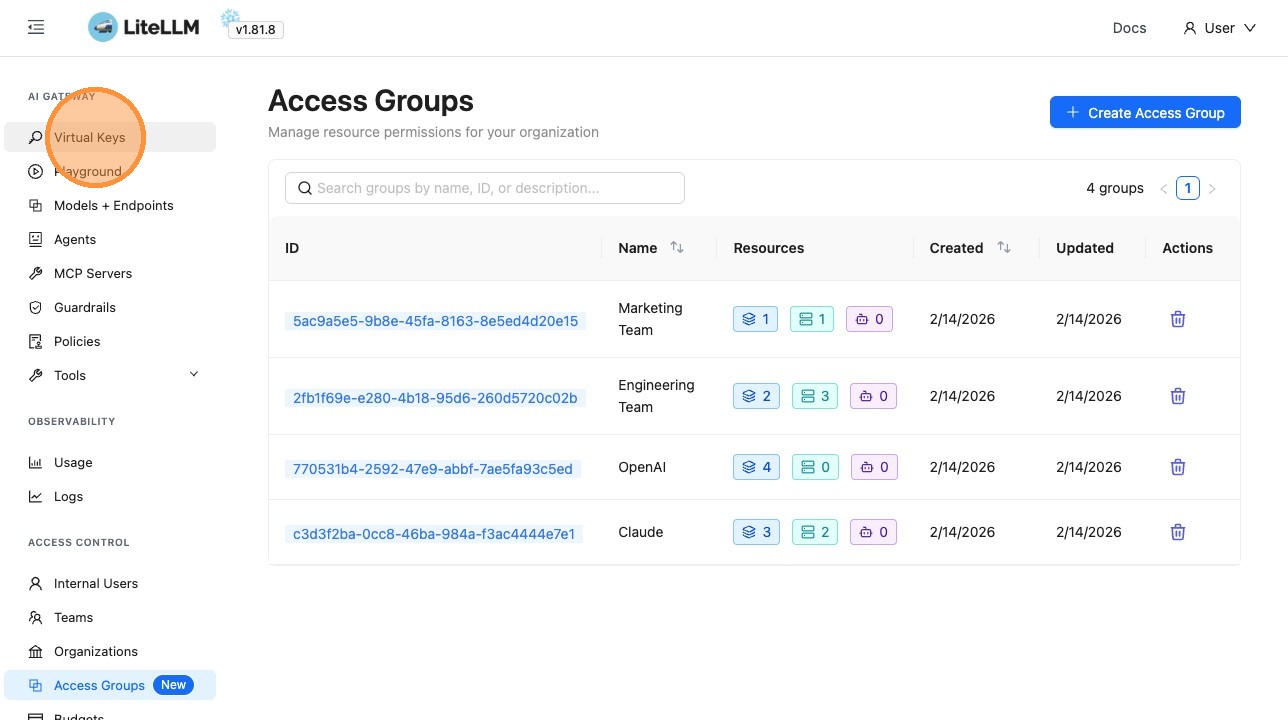 When you add a new model or MCP server to a group, every key and team attached to that group automatically gains access. Remove a resource from the group and itβs revoked everywhere at once.