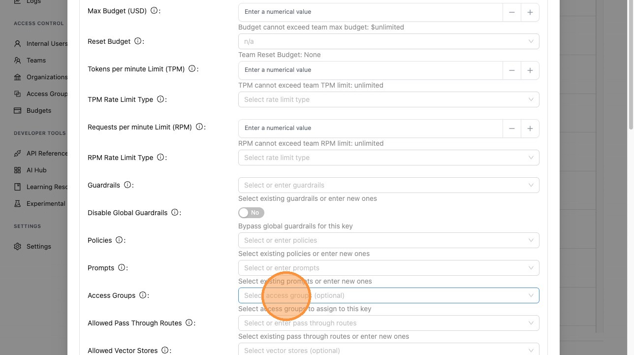 When creating or editing a virtual key, expand Optional Settings and select your Access Group. The key will inherit access to all models, MCP servers, and agents defined in that group.