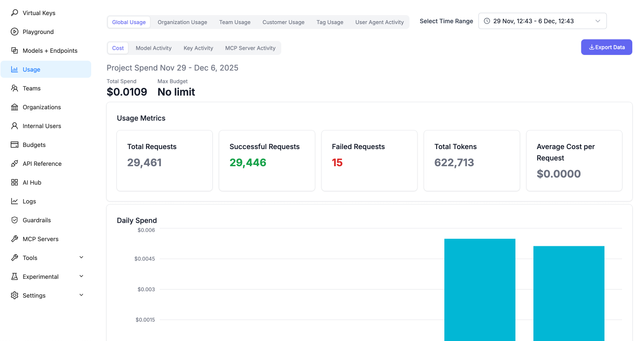 - Activity metrics: Track requests, tokens, and success rates per customer