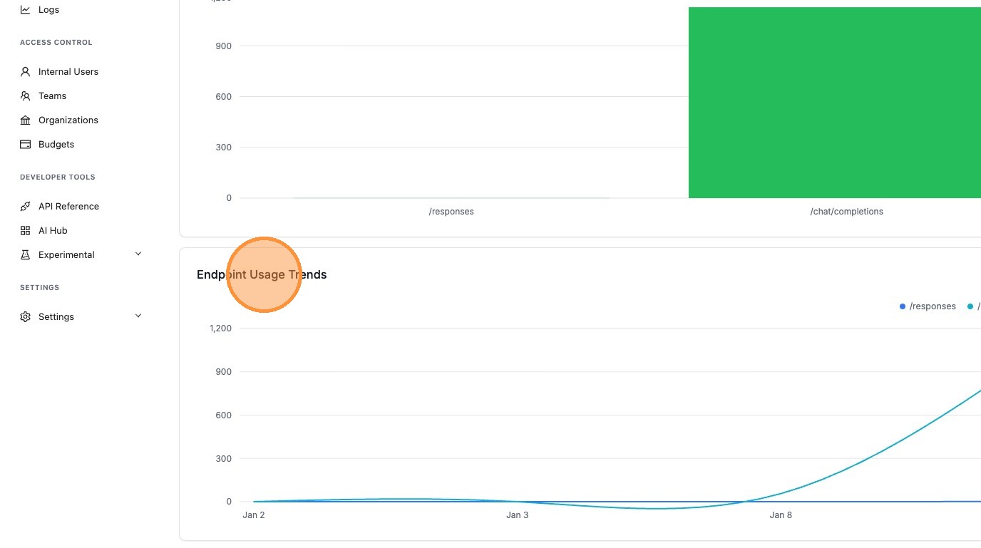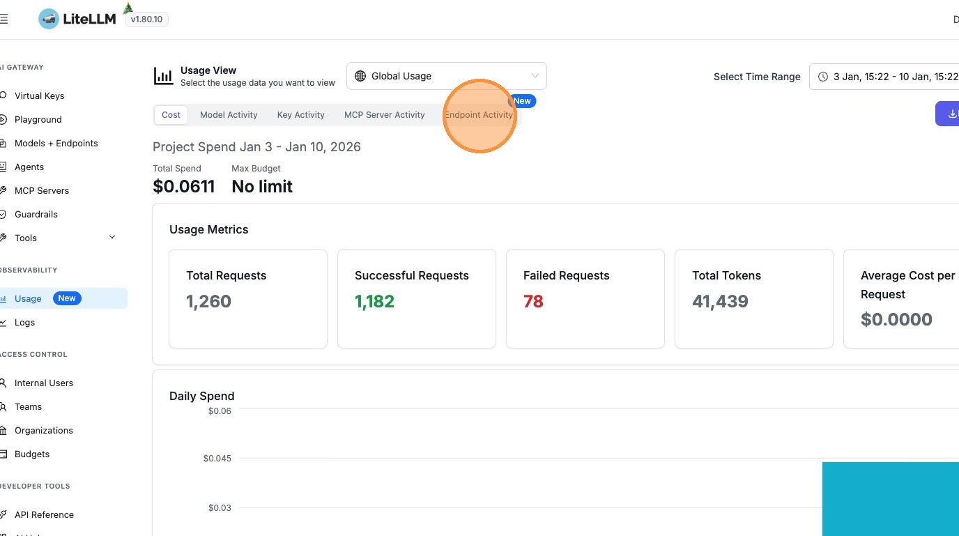 Go to the Usage page in the Admin UI (PROXY_BASE_URL/ui/?login=success&page=new_usage) and click on the Endpoint Activity tab.