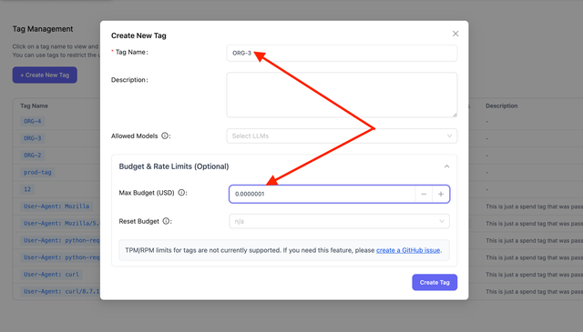 Create a tag to represent a cost center, project, or any budget category. Set max_budget