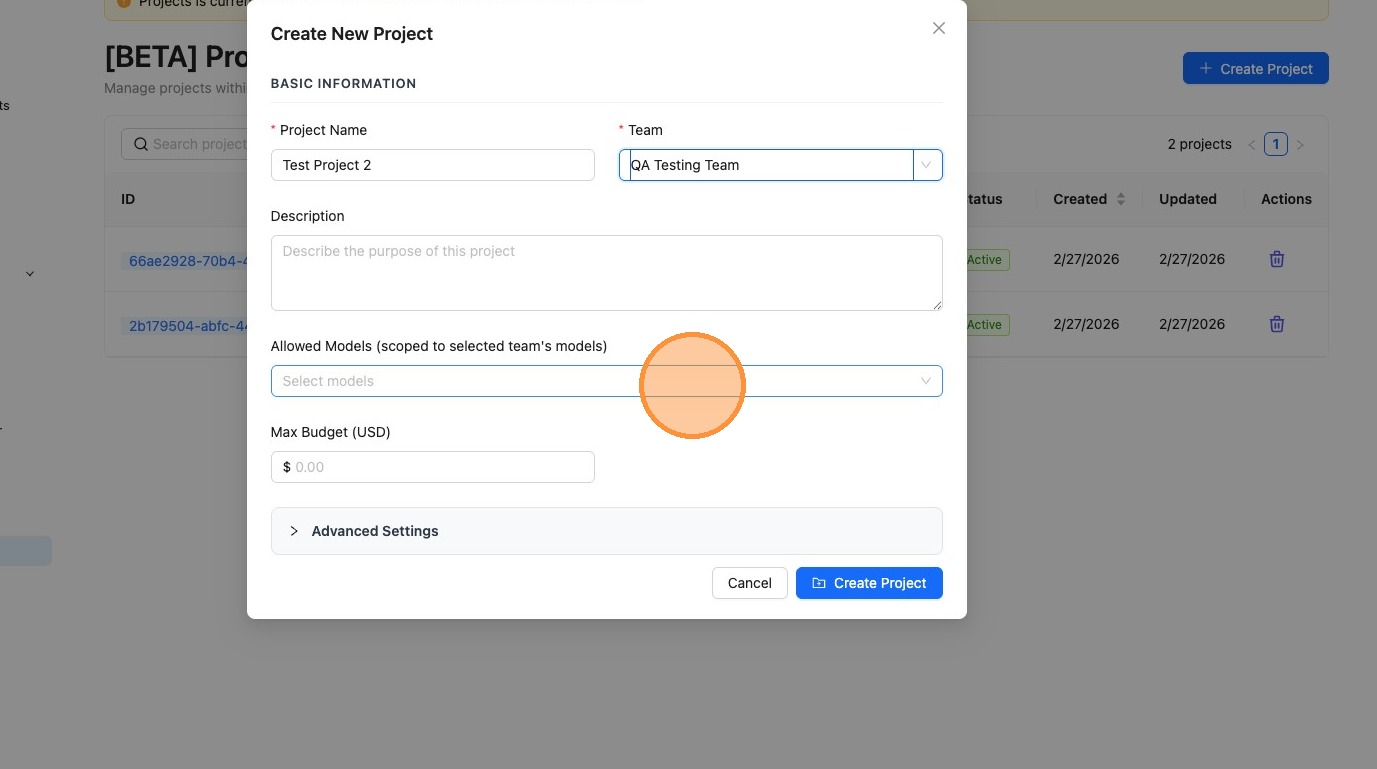 Select which models this project has access to. Available models are scoped to the team's allowed models.