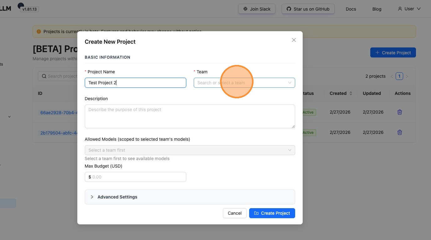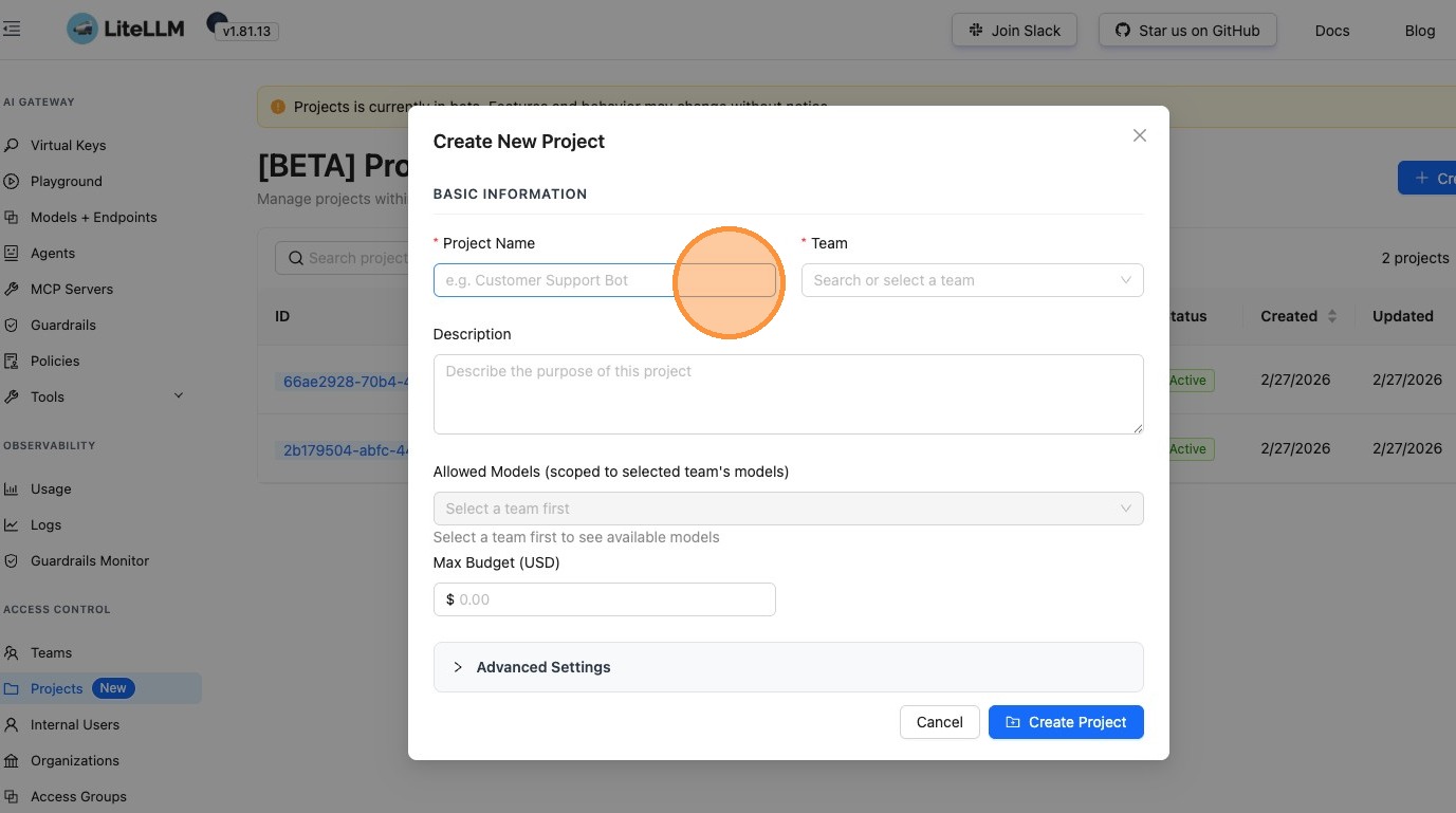Manage projects directly from the LiteLLM Admin UI. Projects sit between teams and keys in your organizational hierarchy, enabling fine-grained access control and budget management for specific use cases or applications.
